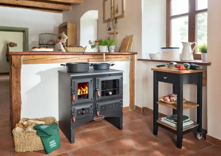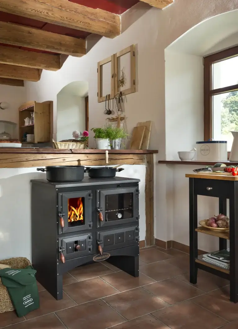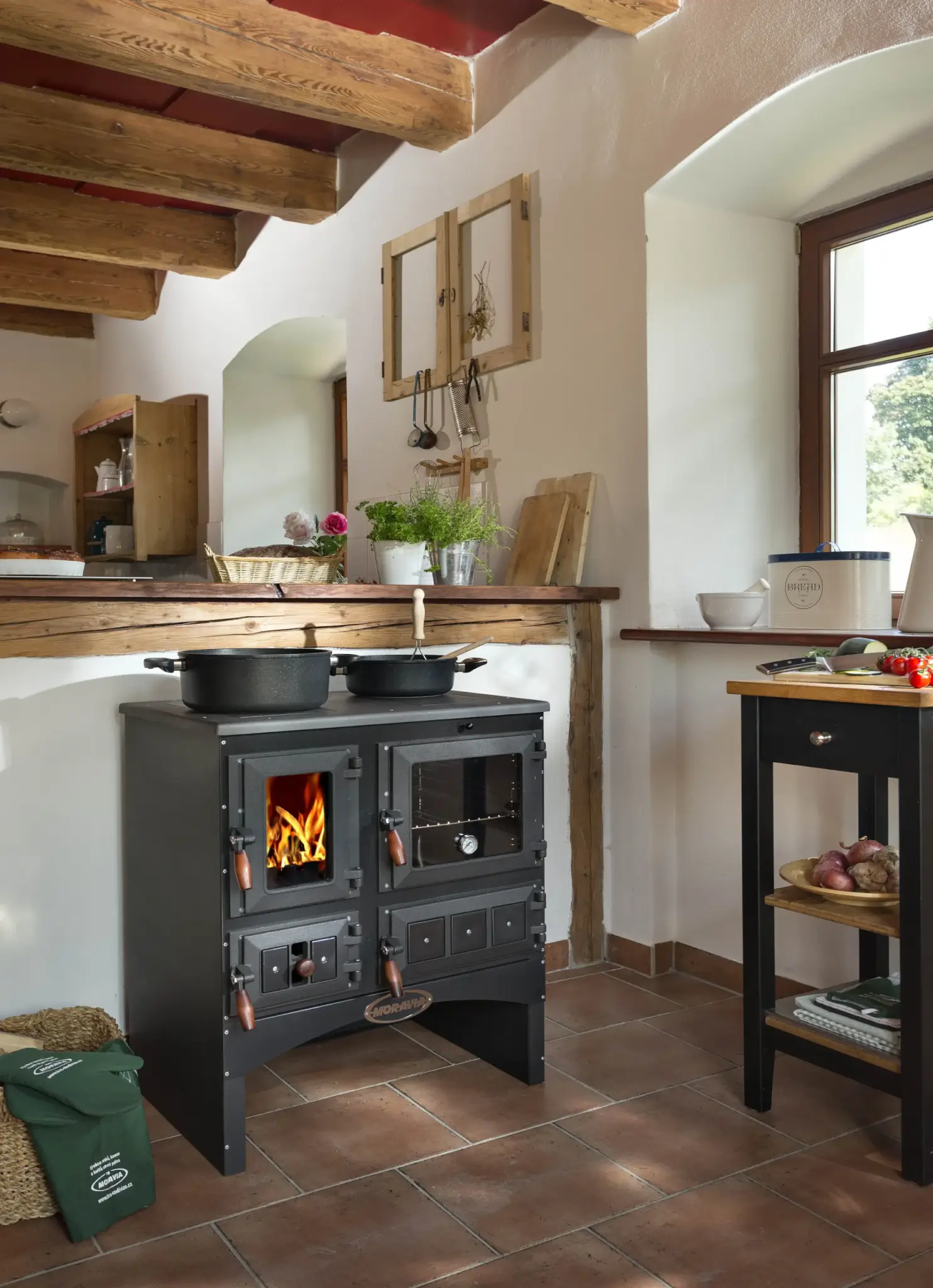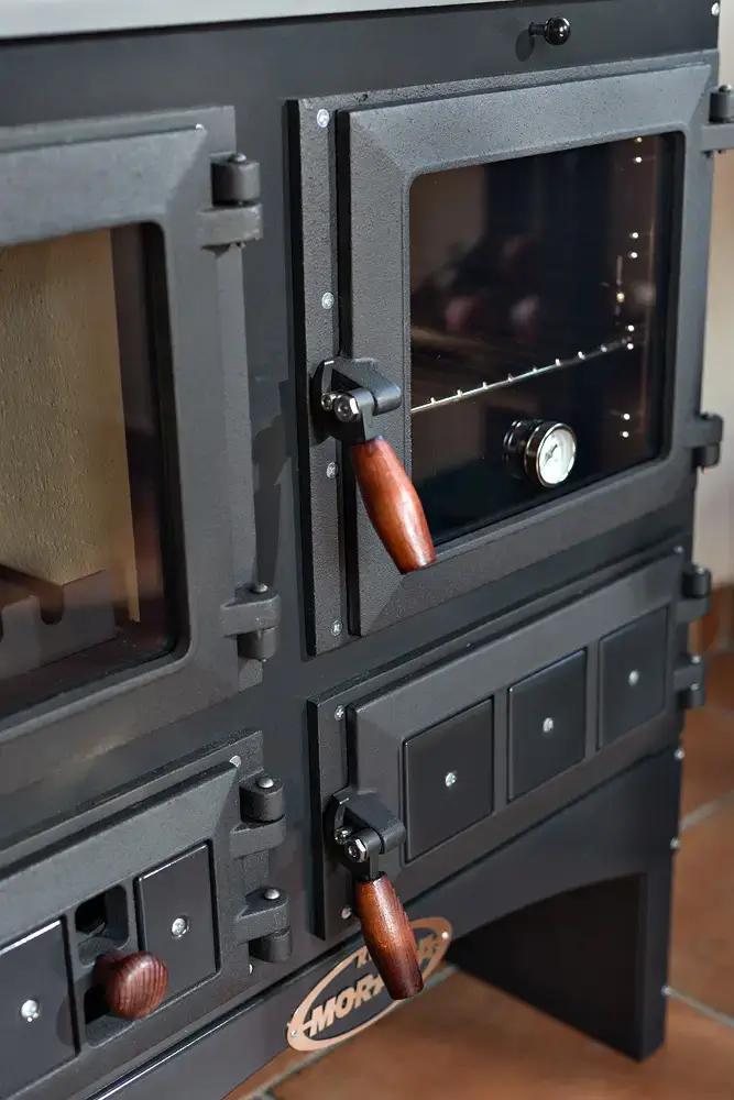 Predná strana je vybavená liatinovými dvierkami s drevenými madlami – ide o novinku, ktorá umožňuje ich pohodlné uchopenie počas prevádzky aj bez chňapky. Priestor pod sporákom je otvorený a vhodný na uloženie paliva.