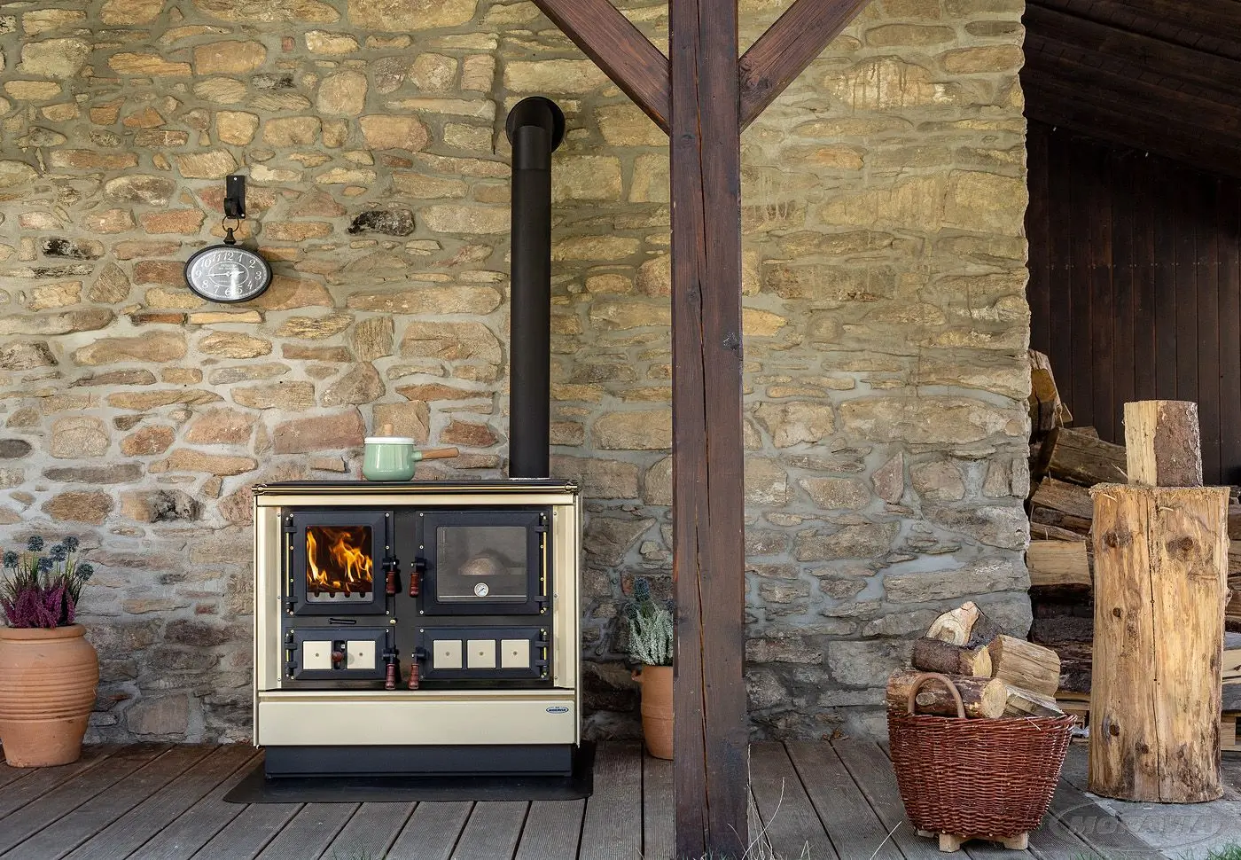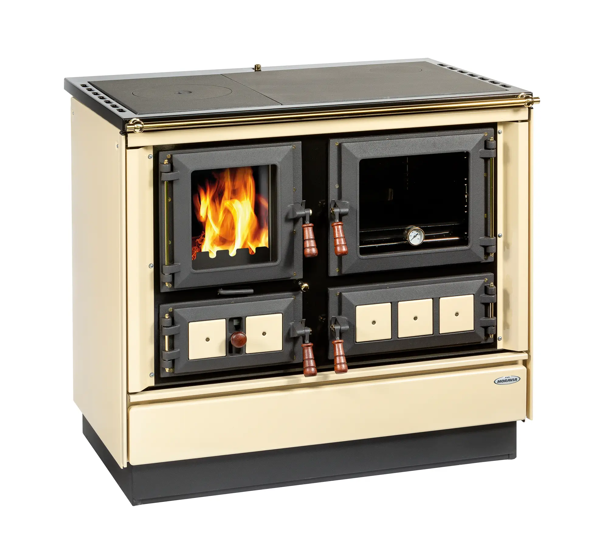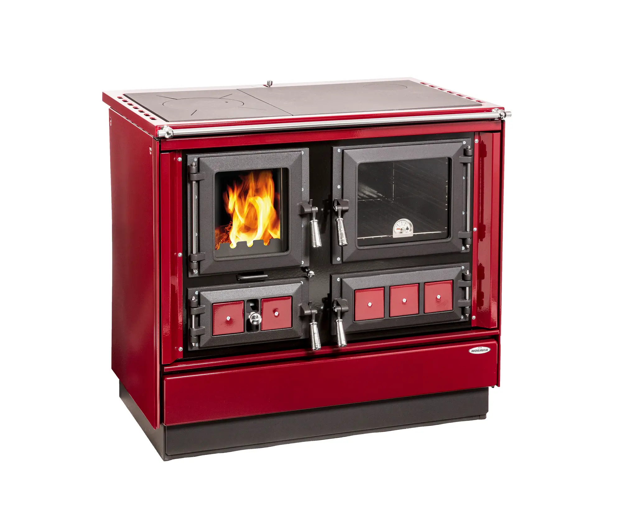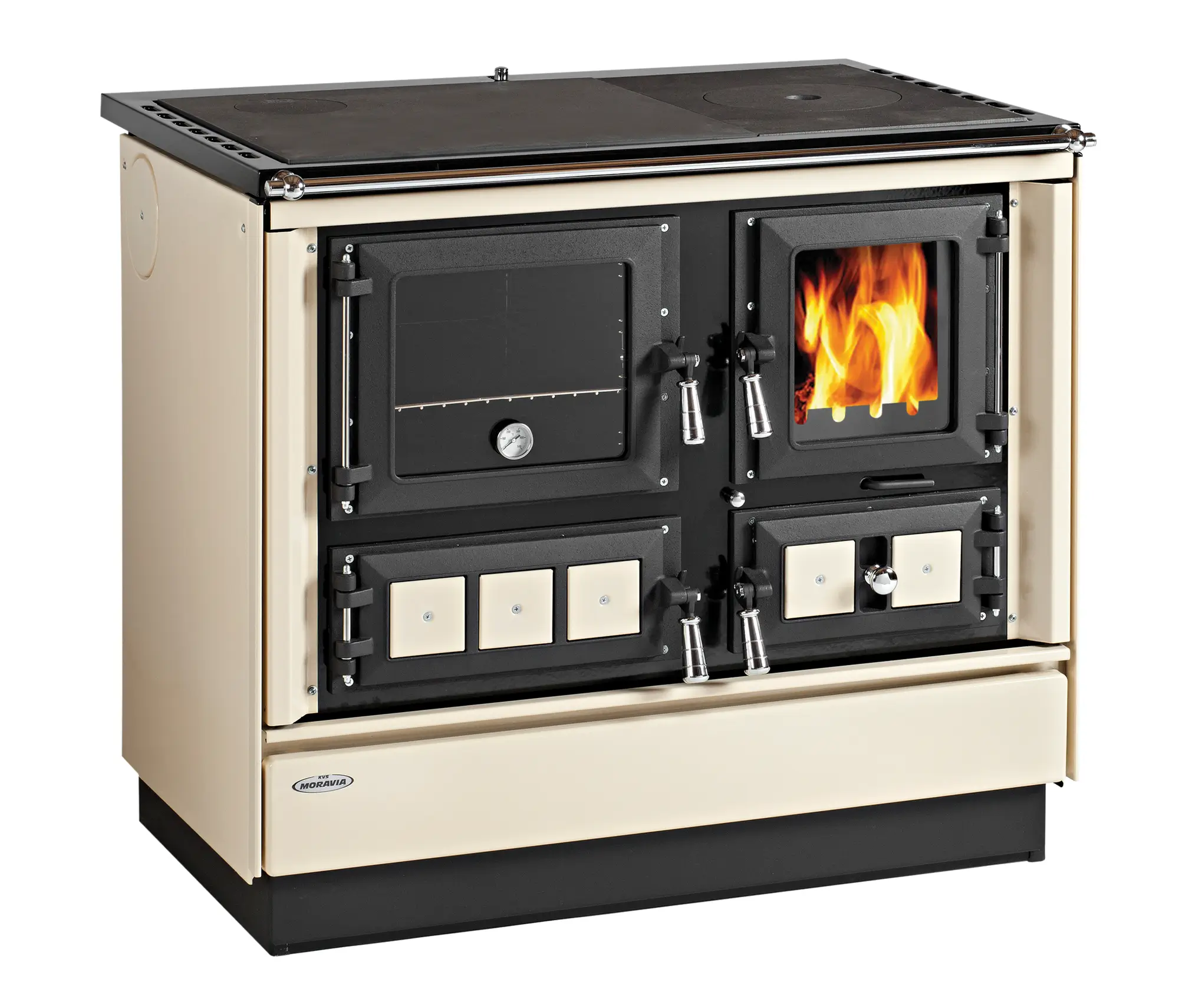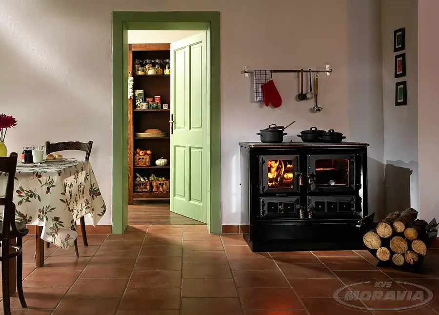 Tento model spája výhody krbových kachlí a sporáka, pretože okrem varenia, pečenia a vykurovania zaujme aj tým, že cez presklené dvierka ohniska je možné pozorovať plápolajúci oheň. Materiály použité pri výrobe tohto typu sú podobné ako pri ostatných modeloch spotrebičov KVS MORAVIA.