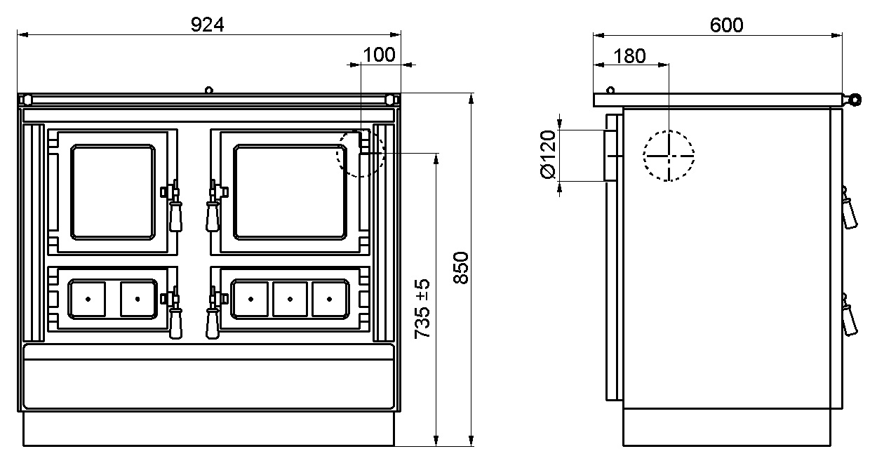 Sporák má už v štandardnom prevedení 3 vývody dymových spalín na pripojenie ku komínu – zozadu, zboku alebo zhora (pozn.: pri použití sklokeramickej platne je možné pripojenie iba z bočnej alebo zadnej strany). Všetky tieto vývody sú umiestnené vedľa seba – viď foto.